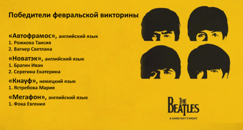 Поздравляем победителей викторины, прошедшей в конце февраля и посвящённой английской группе "Битлз". Лучшими стали: